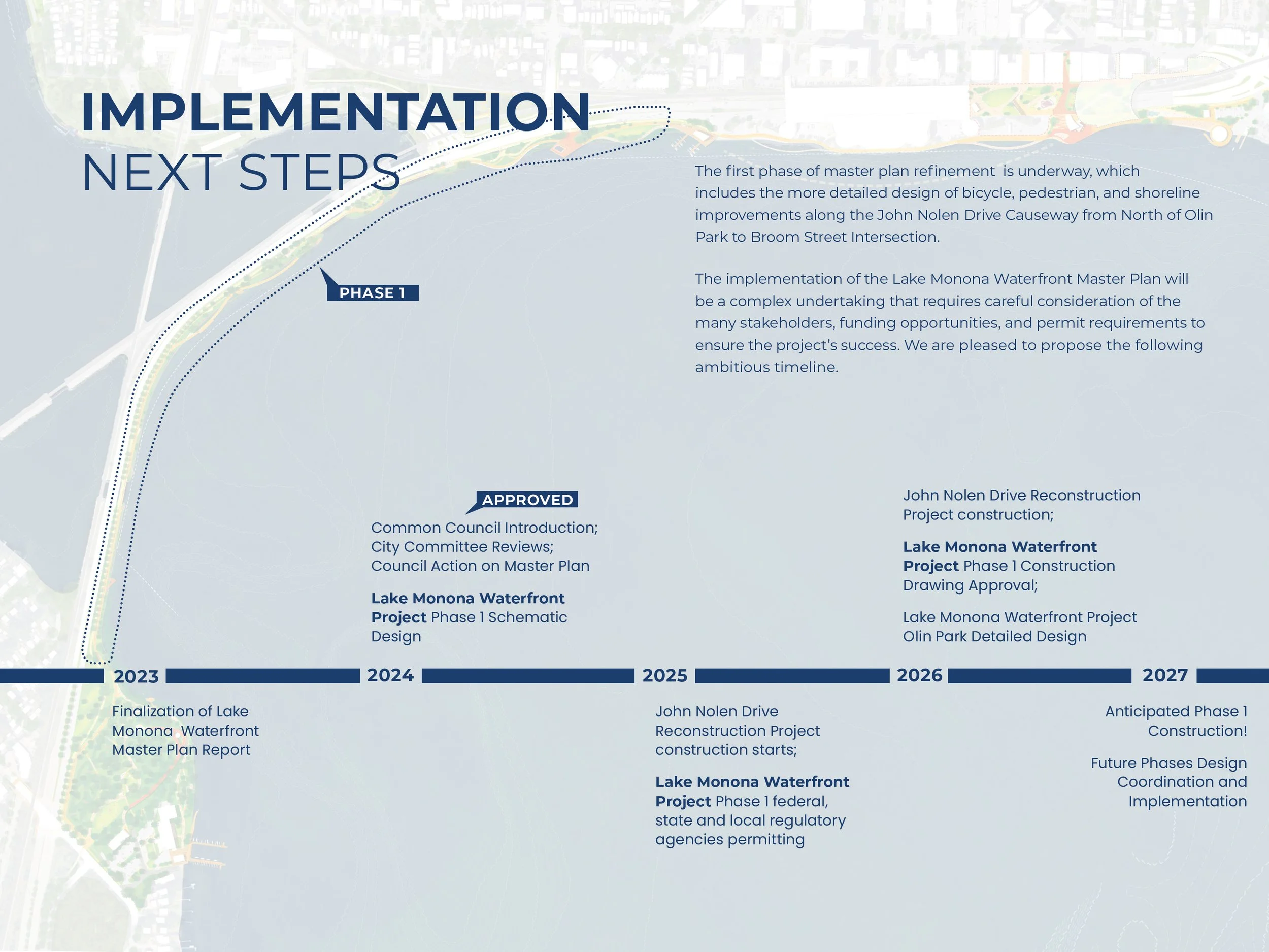 The first phase of master plan refinement is underway, which includes the more detailed design of bicycle, pedestrian, and shoreline improvements along the John Nolen Drive Causeway from North of Olin Park to Broom Street Intersection - The SkyLine!